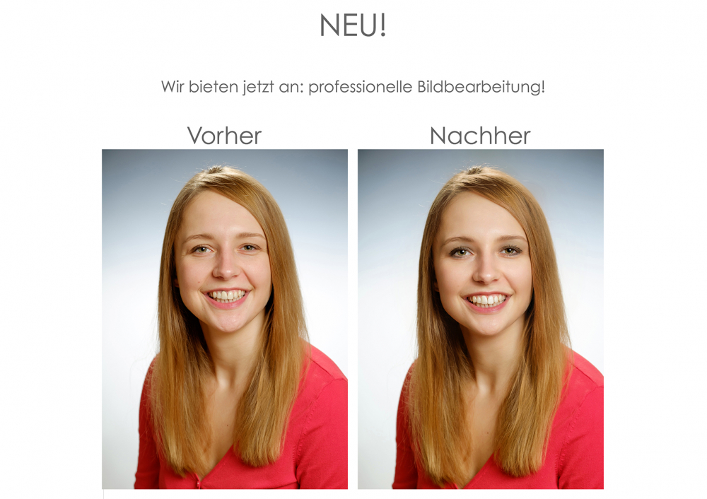 Wir erstellen Ihnen Bewerbungsfotos mit denen Sie sich optimal „verkaufen“ können. Mit Hilfe digitaler Technik fertigen wir verschiedene Aufnahmen mit unterschiedlichen Hintergründen zur Auswahl. Auf einem großformatigen Monitor präsentieren wir Ihnen sofort die Bildergebnisse. Sie entscheiden erst jetzt zwischen Farbe und S/W. Beim Festlegen der optimalen Einstellungen (Farbton, Bildgröße, Ausschnitt...) stehen wir beratend zur Seite. Hautunebenheiten, Rasierunfälle und Reflexe in Brillengläsern sind Dank elektronischer Retusche kein Problem mehr. Fotos in Top-Qualität stehen Ihnen in ca. 15 Minuten zur Verfügung, selbstverständlich auch nachbestellbar und digital auf CD.